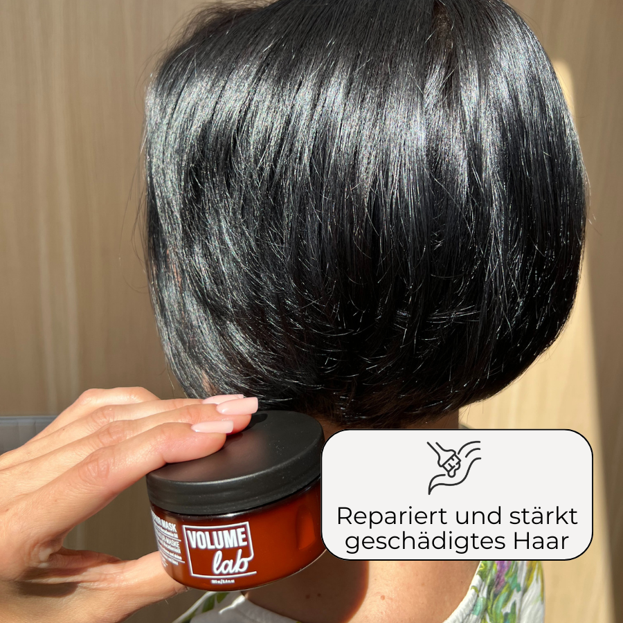 Volume Lab Haarmaske (100 ml): AQUA, CETEARYL ALCOHOL, BEHENAMIDOPROPYL DIMETHYLAMINE, RICINUS COMMUNIS SEED OIL, COCOS NUCIFERA OIL, MACADAMIA TERNIFOLIA SEED OIL, HYDROXYETHYL UREA, LACTIC ACID, BENZYL ALCOHOL, SODIUM BENZOATE, QUATERNIUM-80, POTASSIUM SORBATE, HYDROLYZED SOY PROTEIN, HYDROLYZED WHEAT PROTEIN, D-PANTHENOL, GLYCOLIC ACID, GLYCERIN, PEG-7 GLYCERYL- COCOATE, LAURYL GLUCOSIDE, CAPRYLYL/CAPRYL GLUCOSIDE, BIOTIN, FRAGRANCE, PROPYLENE GLYCOL, PHENOXYETHANOL, PROPANEDIOL, ARGININE, GLYCINE SOJA GERM EXTRACT, TRITICUM VULGARE GERM EXTRACT, GLUCONOLACTONE, CALCIUM GLUCONATE.